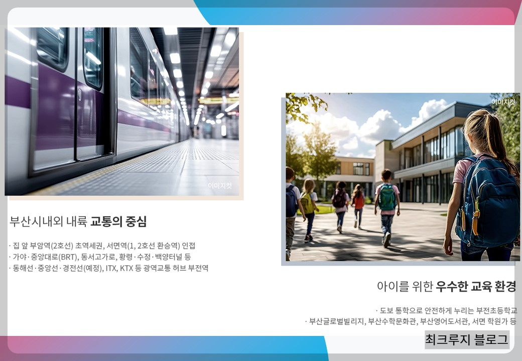 생활인프라도 좋은 편 인데,부전초등학교와 서면중학교,문현여고등 학교와 가깝고 롯데백화점,이마트트레이더스,홈플러스등 대형 쇼핑몰과도 인접하며 부산 시민공원 및 팔금산 공원과 가까워 생활환경도 쾌적한 편 입니다.