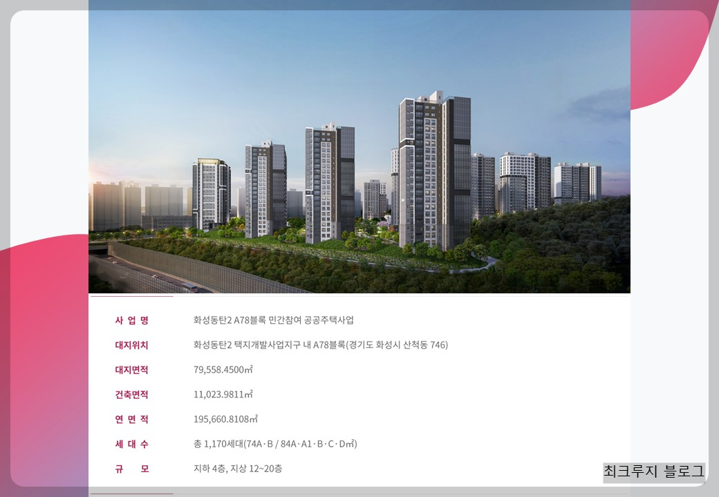 규모: 지하4층~지상 최고 20층,13개동 총 1,170세대(특별공급 876세대,일반공급 294세대) 전용면적 85㎡이하 국민주택
