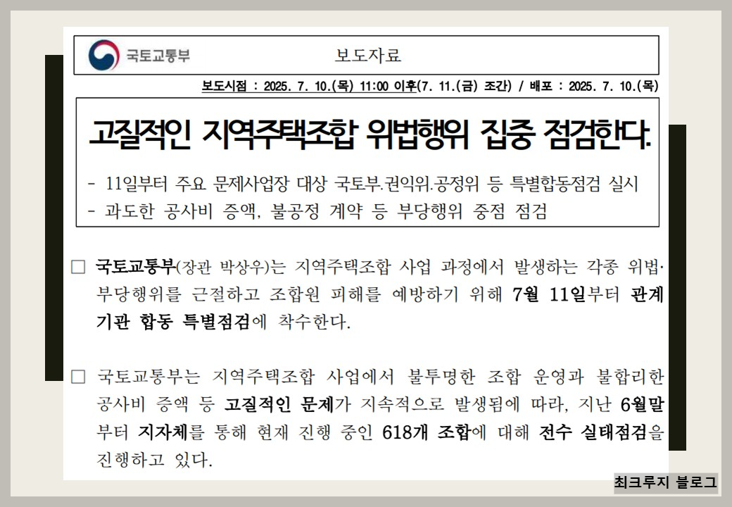 국토교통부는 지역주택조합 사업 과정에서 발생하는 각종 위법 및 부당행위를 근절하고 조합원 피해를 예방하기 위해 7월11일부터 8월말까지 관계기관 합동 특별점검에 착수한다고 오늘 발표를 했습니다.이번 점검은 국토교통부,공정거래위원회,국민권익위원회,지방자치단체,한국부동산원,주택도시보증공사(HUG)등 6개 기관이 참여합니다.