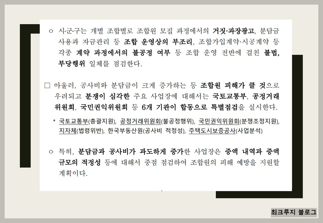2.조합원 피해 예방:과도한 공사비 증액,불공정 계약,허위·과장광고 등 반복적으로 발생한 위법·부당 행위에 대해 집중 점검을 실시함으로써 조합원 피해가 줄어들 것으로 기대 됩니다.