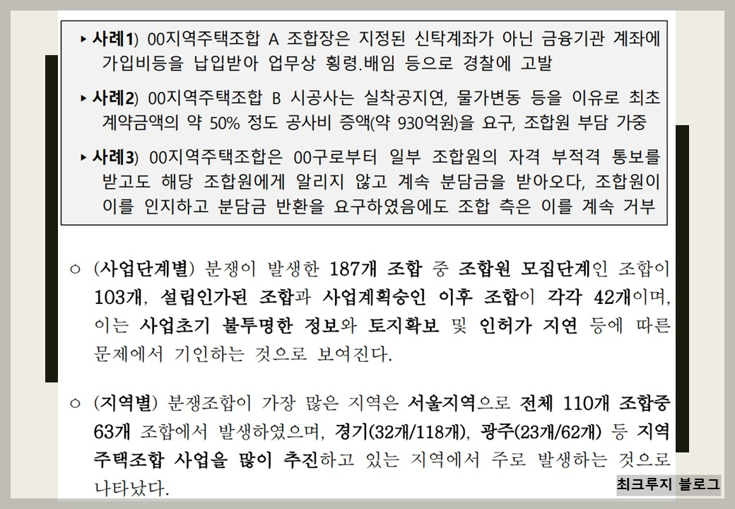 | 조합 운영상 부조리 | 조합 운영 투명성 부족,자금관리 미흡,조합원 의사 반영 미흡 등 |