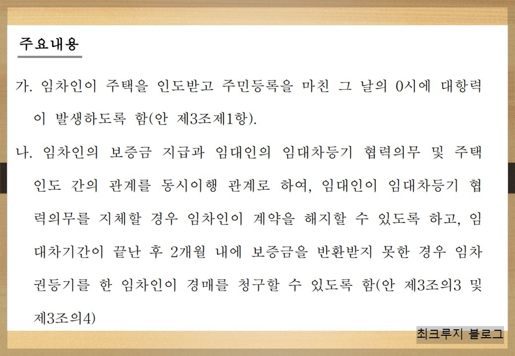 개정안 발의는 현재 여당 및 범여권으로 분류되는 진보당,조국혁신당 등의 국회의원 10명이 발의를 했는데요,큰 틀에서 내용을 요약해 보자면 임대차 기간을 현재 2년에서 3년으로 확대,계약갱신청구권을 현재 1회에서 2회 즉 최대 9년간 전세 거주가 가능하고 임차인의 대항력 권리 발생도 입주 다음날 0시가 아닌 입주당일 0시로 앞당겨 대항력을 갖추게 했습니다.