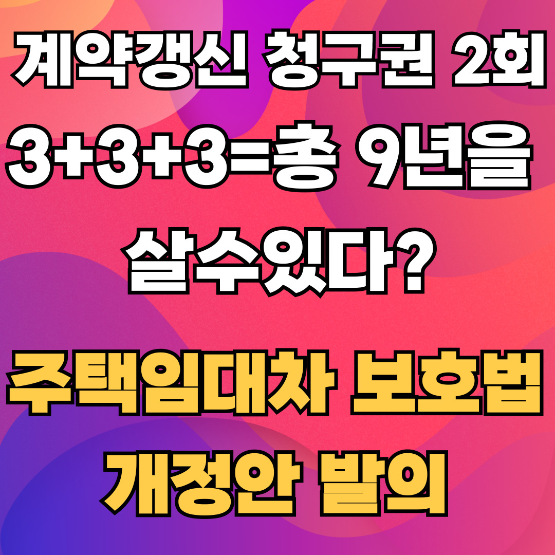 관련 내용을 간략히 보면 현재 1회에 한정된 계약갱신청구권(2+2년)을 2회로 늘리고,임대차 기간인 2년을 3년으로 확대하여 최대 9년(3+3+3년)까지 거주할수 있도록 하는 법안을 발의 했습니다.
