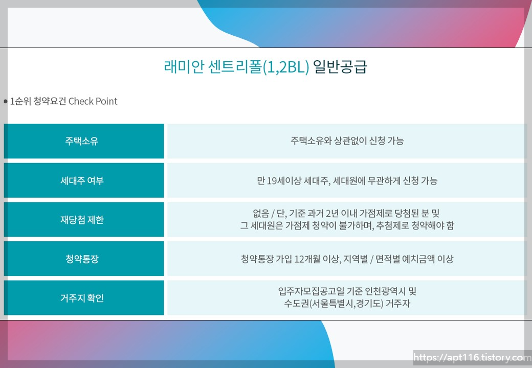사업지인 인천은 비투기과열지구 및 비청약과열지역으로 주택소유와 상관없이 1순위 신청이 가능합니다.