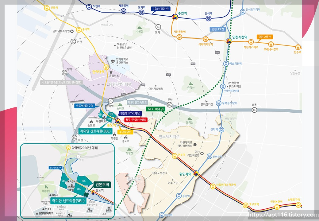 송도역 주변은 이미 개발이 진행중이죠,추후 시티오씨엘지구 까지 포함하면 약 2만여가구가 예상되는데요,무엇보다 송도역은 인천발 KTX시작점이 되는 곳 입니다.