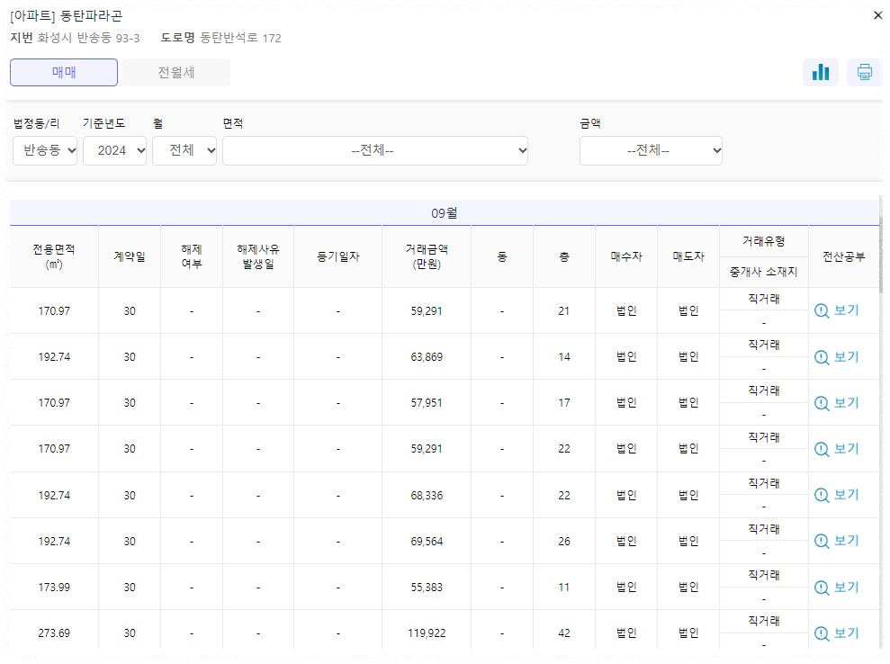 거래가액은 시세의 반값에 수십건이 넘는 거래가 동시에 이뤄졌는데요,3일 국토교통부 실거래가 공개시스템에 따르면 지난 9월30일 경기도 화성시 반송동 '동탄 파라곤'주상복합 아파트에서 아파트 매물 42가구와 오피스텔 12가구가 시세에 한참 못 미치는 가격에 일괄 거래가 됐습니다.