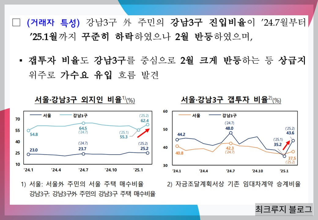 서울 주간 주택 거래량을 보면 1천건에서 2천건까지 도달하는데 작년에는 13주,약 3개월가량 소요 됐으나 최근에는 4주만에 도달하면서 급증세를 보였는데요,이와 더불어 강남3구가 아닌 주민이 강남3구 진입비율이 1월에서 2월이 갑자기 반등을 하며 갭투자 비율도 늘어 났습니다. 즉 이른바 상급지 위주로 유입이 늘었다는 증거 인데요,문제는 오락가락 하는 정책때문에 실수요자들이 큰 피해를 보고 있다는 점 입니다.